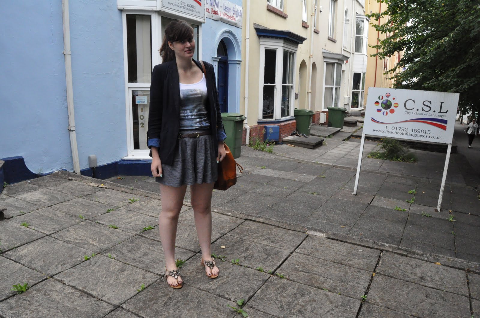 El bolso lo compre en Swansea en H & M y las sandalias en Zara de Barcelona. El blazer azul marino es de Zara.