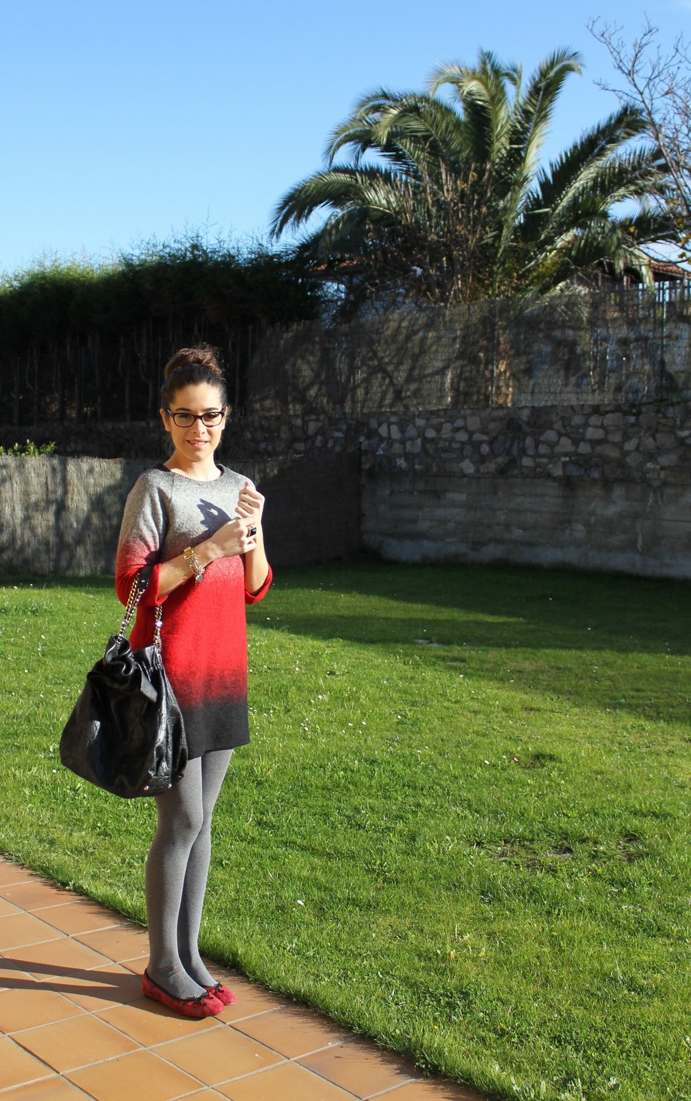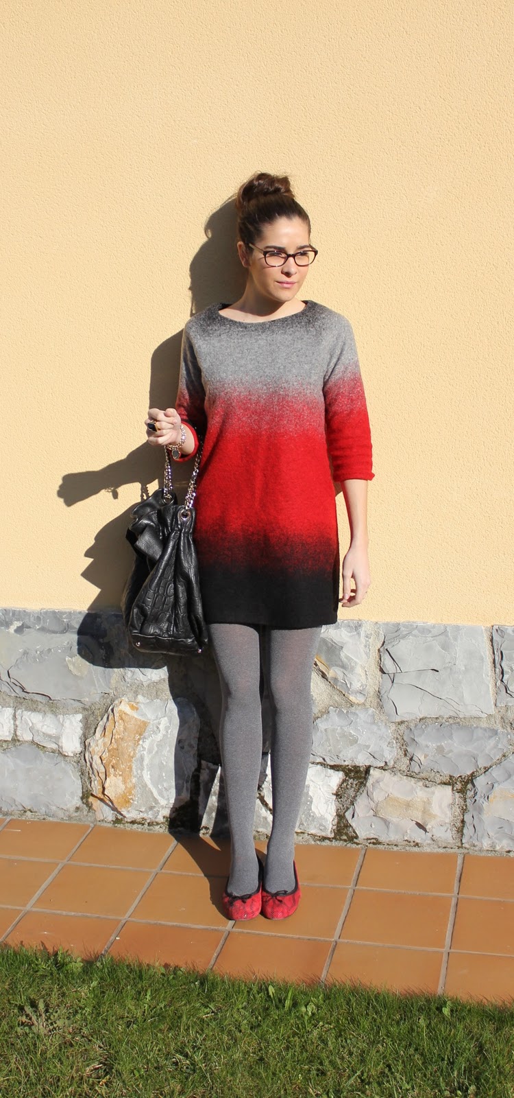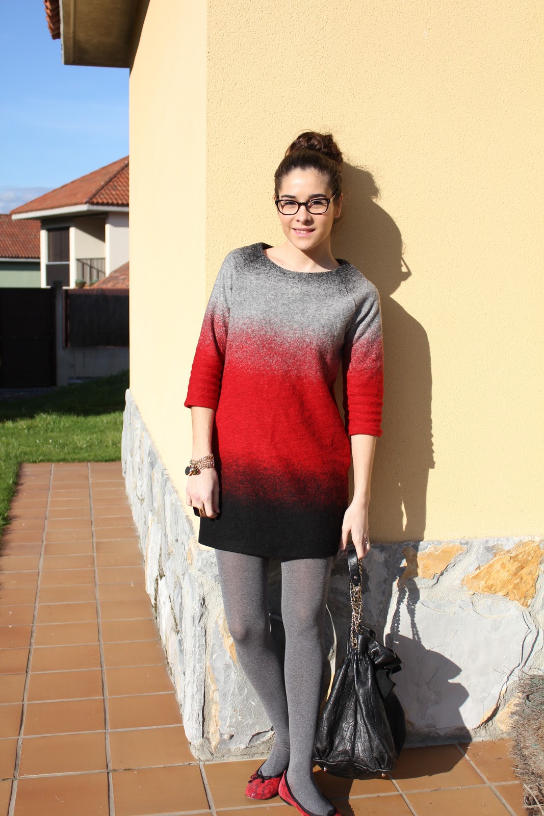 Hola guapa lo prometido es deuda! aki estoy, me encanta este vestidito y la combinacion con las medias grises y las bailarinas espectacular! por cierto que bien te sientan las gafas!