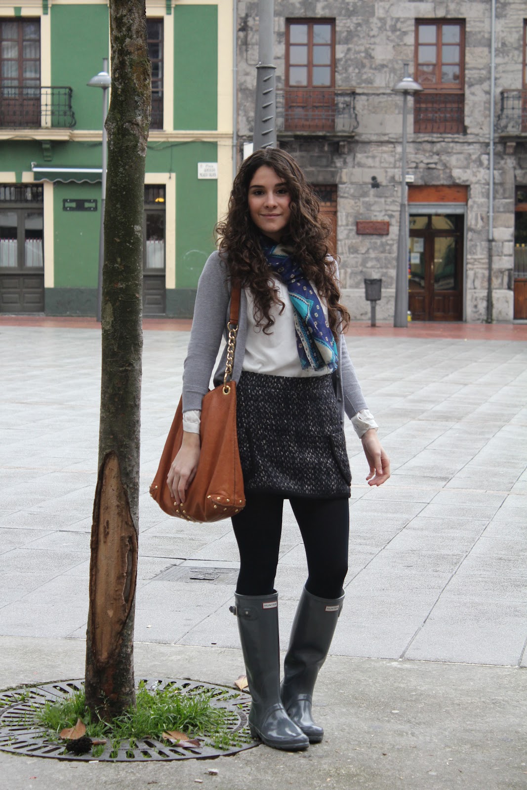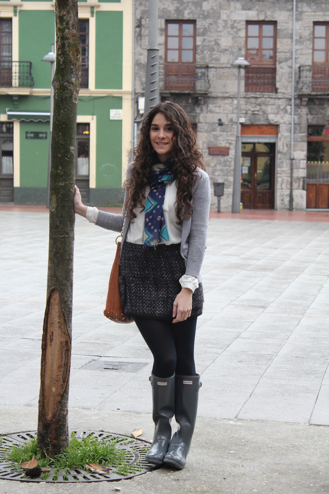 Y después de este gran sermón, vamos a lo que vamos! Este look lo llevé el otro día a la Universidad, no sabía muy bien si iba a llover o no, así que decidí calzarme las Hunter, por si las moscas!! Y hacía bastante fresqui, así que opte por prendas calentitas; la falda que llevo en este post fue un regalo de cumpleaños de Cris y otras dos amigas que me gustó un montón y es perfecta para estos días en los que el termómetro no concede tregua!