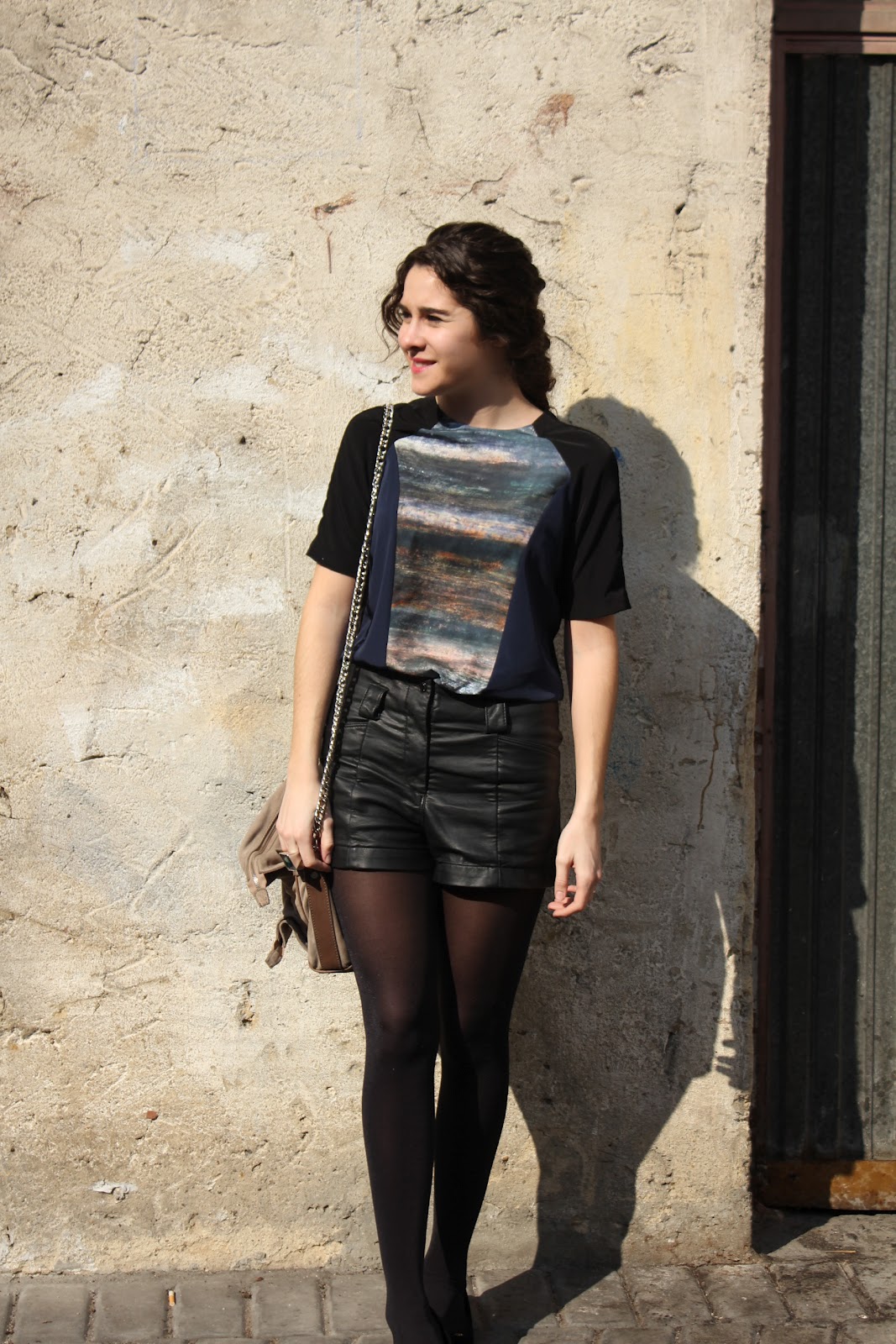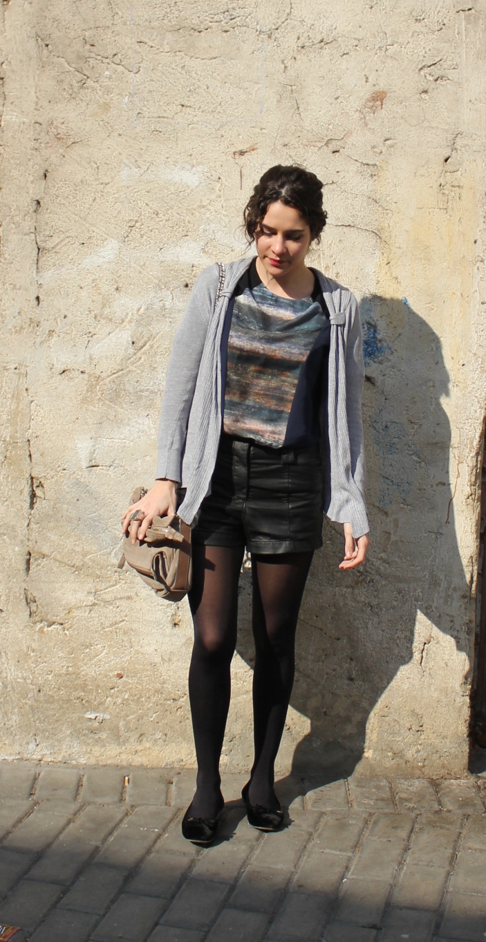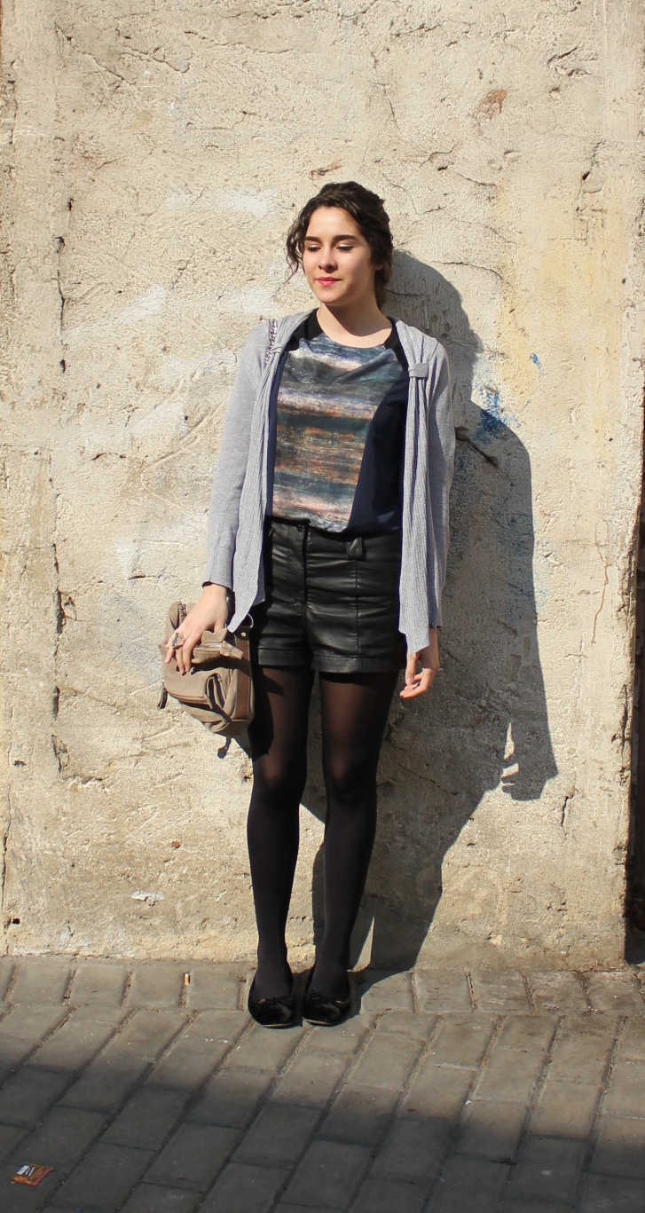 Hoy un look muy cómodo, para ir a clase con unos shorts de cuero que ya habéis visto alguna vez, y una camiseta adquisición de rebajas, me gustó por lo original de su estampado, pero claro en ese momento de euforia nunca piensas ¿con qué me la pongo? No ha sido demasiado dificil de combinar tampoco, con unos vaqueros también quedaría bien, pero no quería algo tan sencillo…