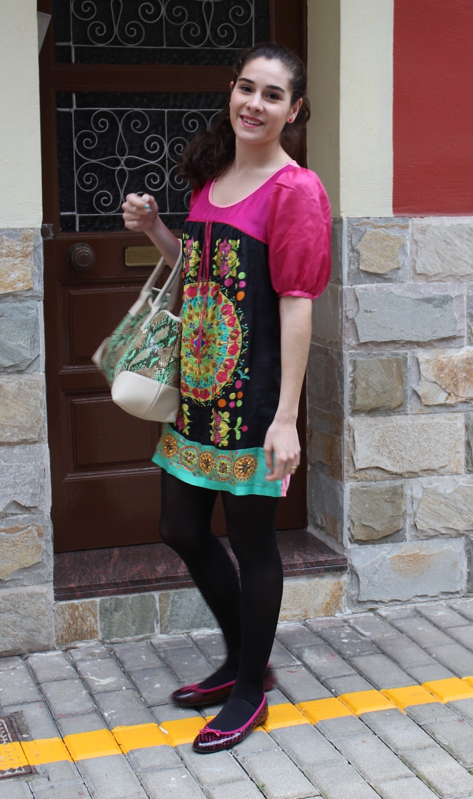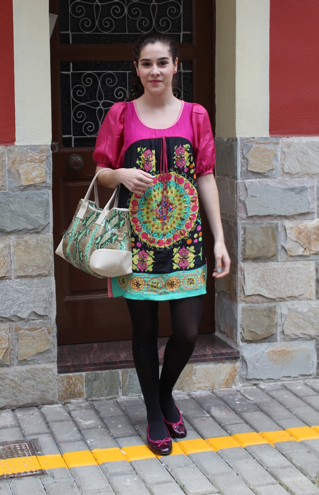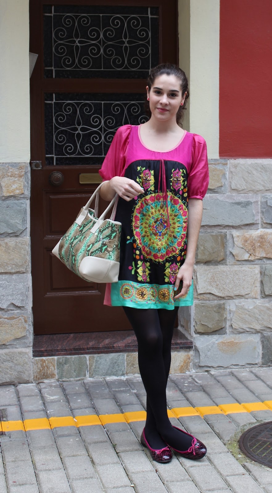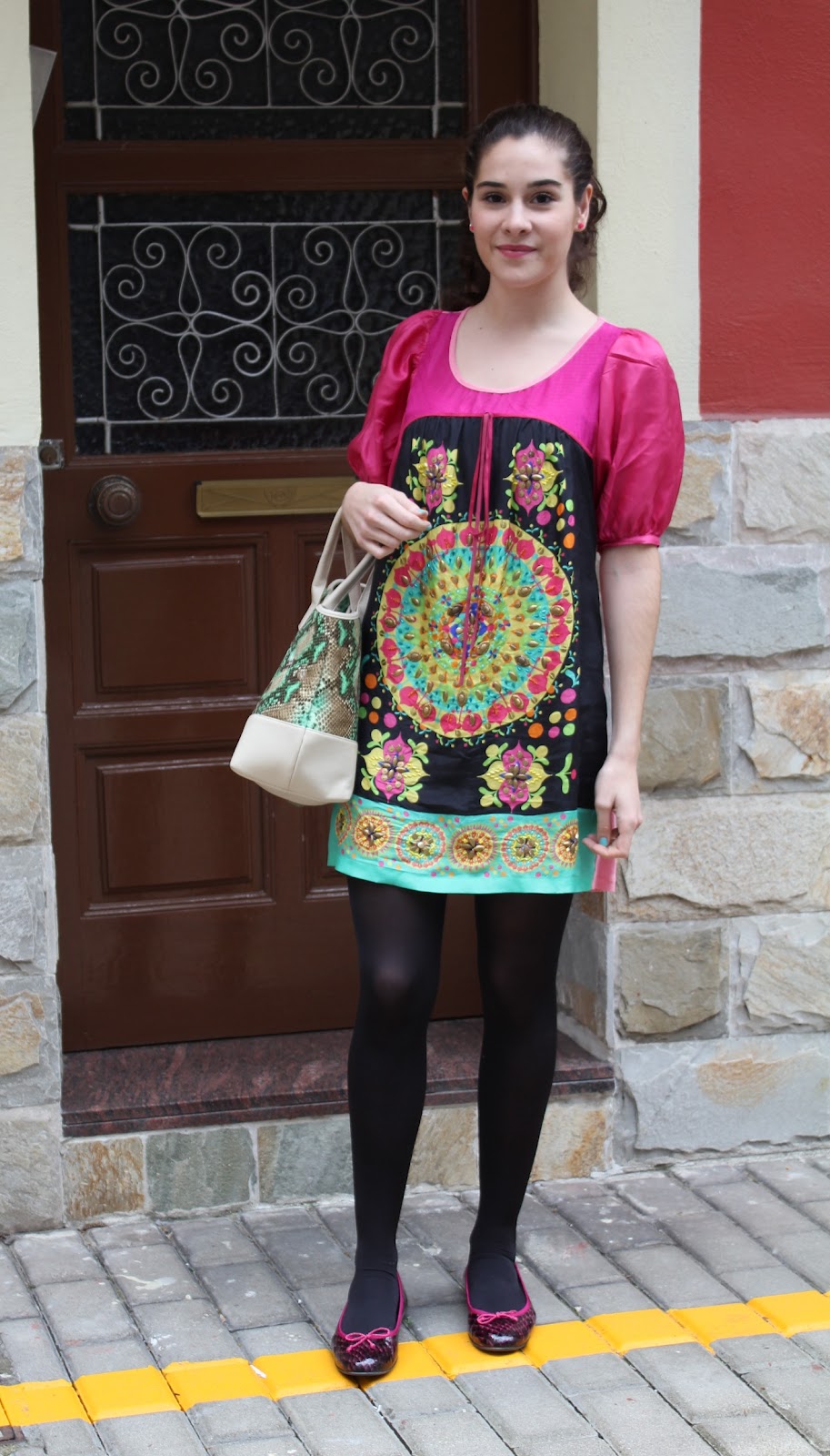 Para el look de hoy rescaté un vestido de Custo que tengo desde hace algo menos de dos años y que me gusta bastante por su colorido y porque te lo puedes poner tanto en verano sin medias como en entre tiempo con ellas, el bolso repito el del último post porque la verdad es que me gusta un montón y es muy cómodo.