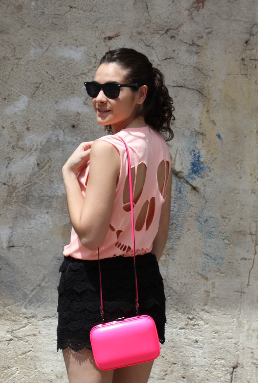 El look que os enseño hoy es bastante veraniego (para que lo aprovechéis en estos días tan ideales que yo me estoy perdiendo), la camiseta es muy sencilla, pero me encantó por el detalle de la espalda, y de nuevo vuelvo a incluir en un look el clutch flúor que me encanta! Espero que os guste!!