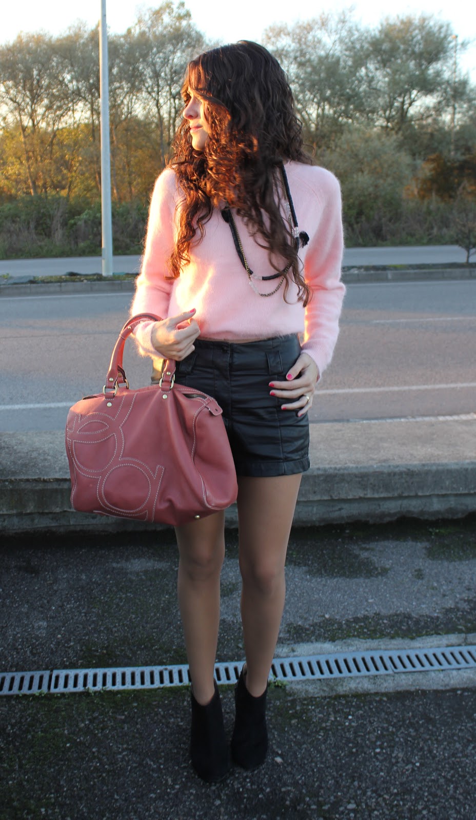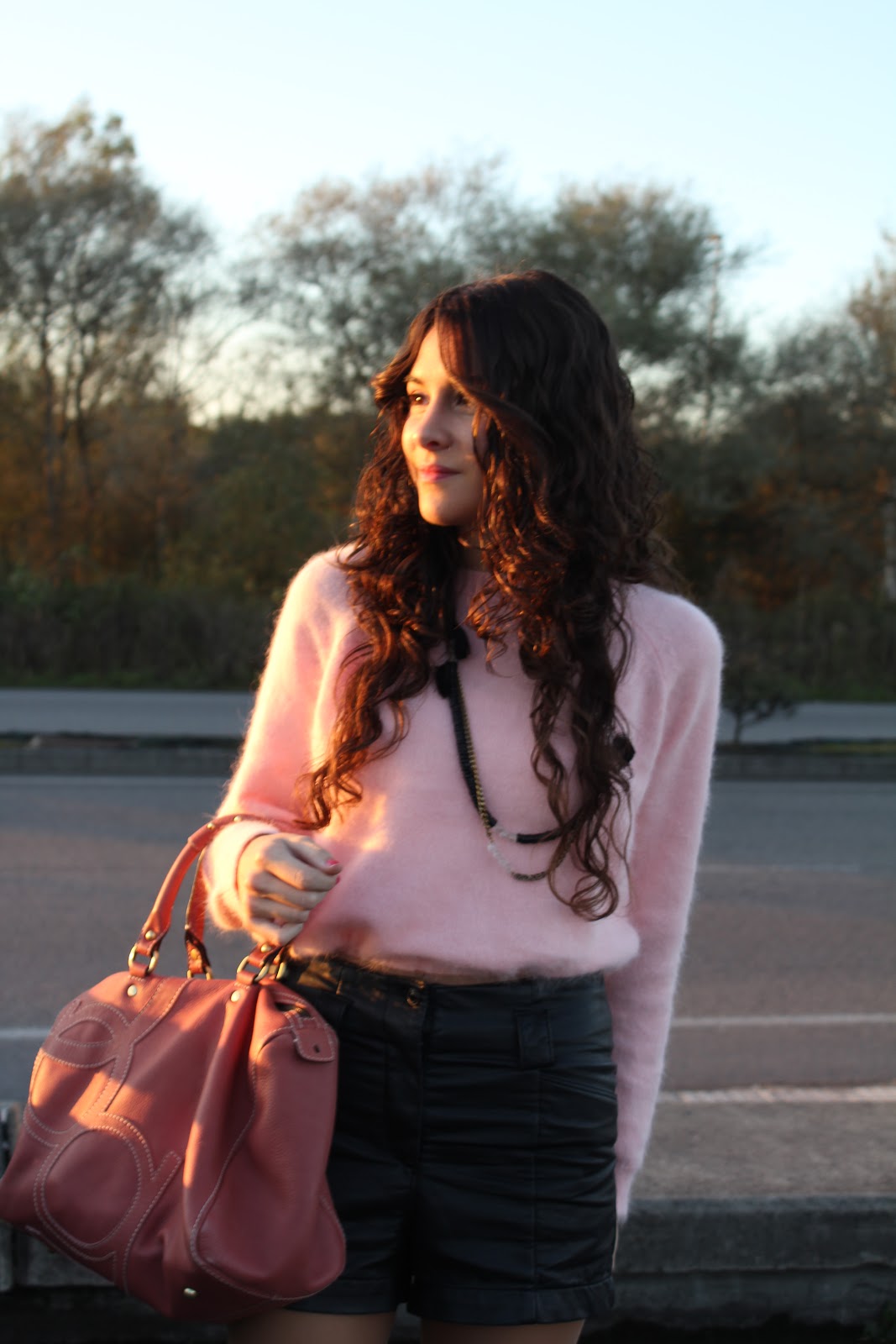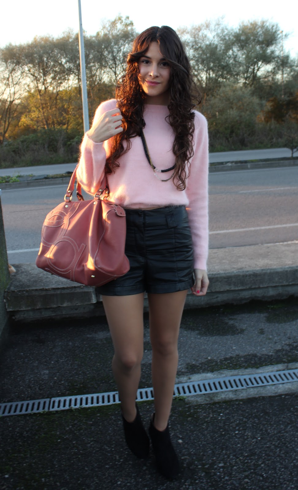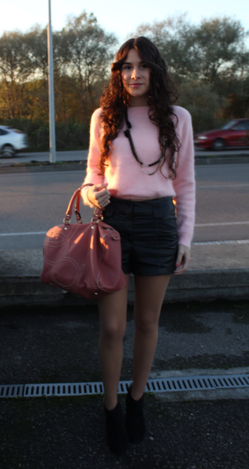 Que guapa ! Me encanta como el rosa del sueter y el bols suavizan el look !