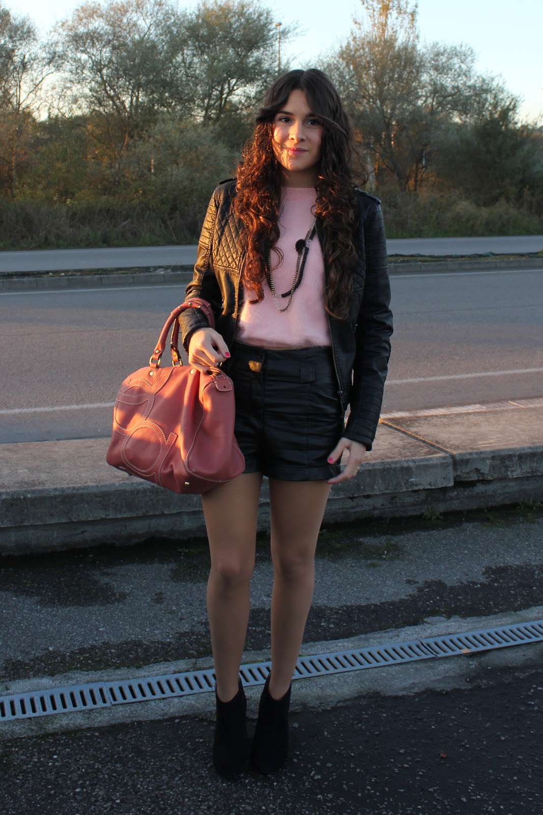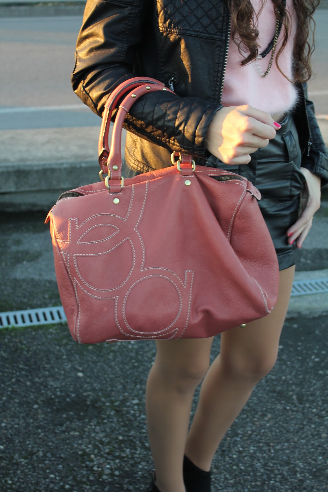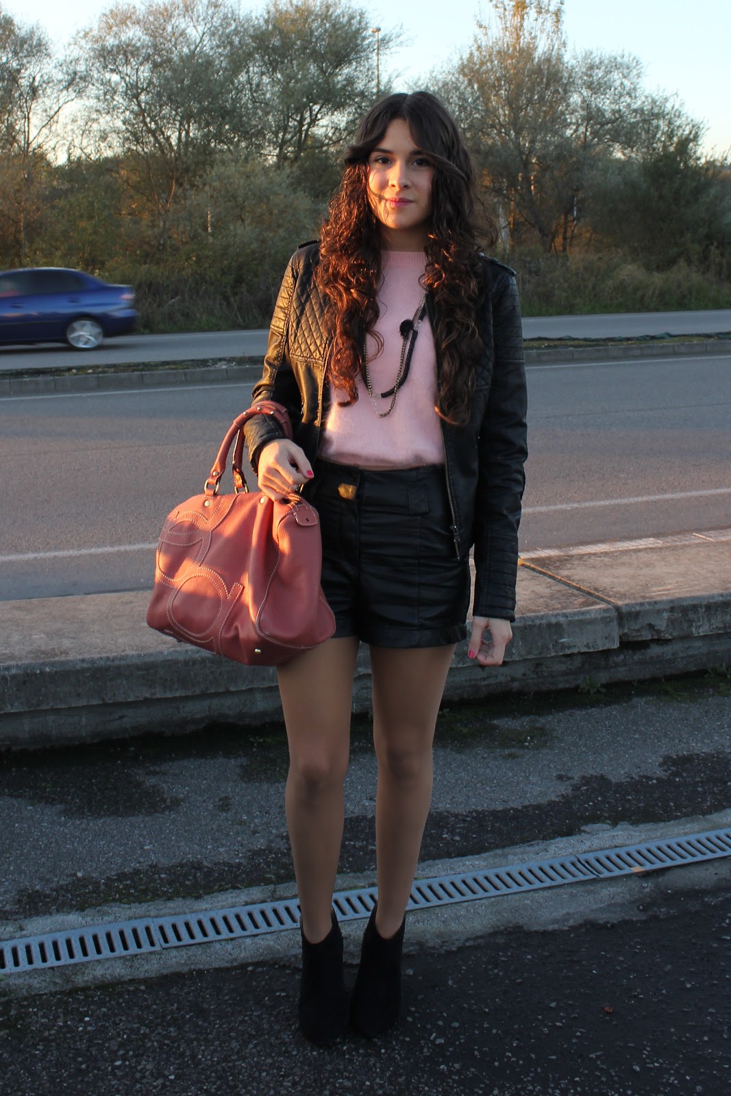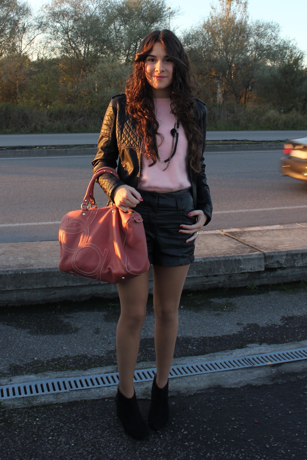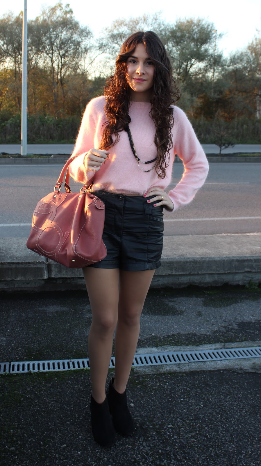 Que guapa ! Me encanta como el rosa del sueter y el bols suavizan el look !