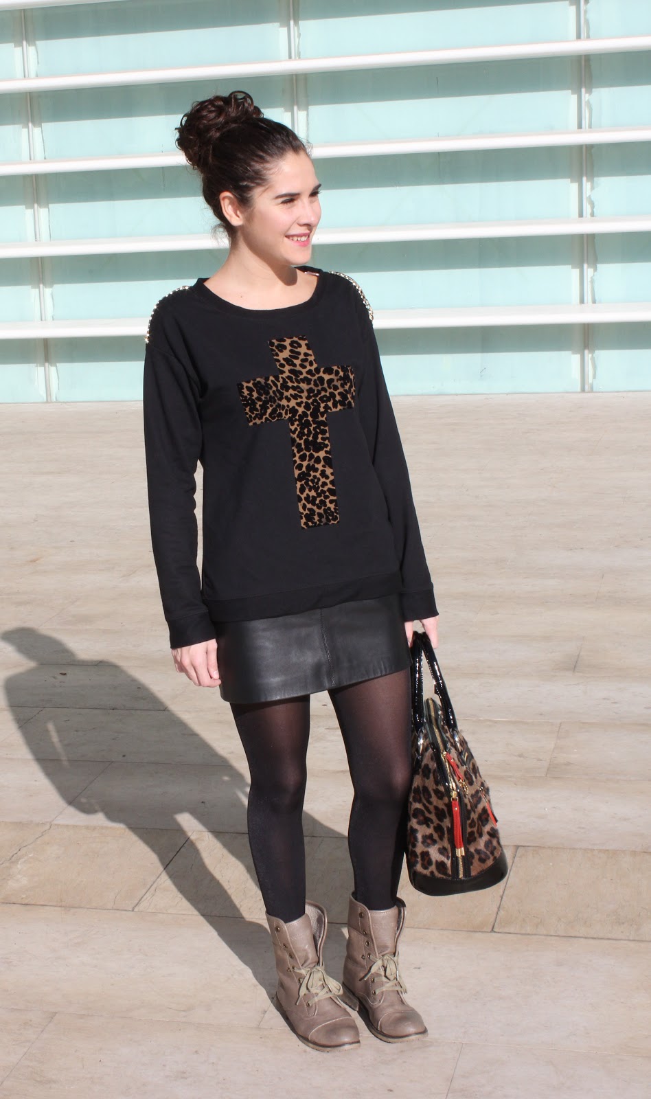 En el look de hoy vuelvo a jugar con bastantes tendencias, para empezar la sudadera, aunque yo soy mas de vestidos, faldas y camisas ahora las sudaderas se llevan mucho y todas tenemos un día en que nos apetece ir más cómodas y también abriga bastante por cierto. La verdad es que cuando ví esta me encantó, no se si por la cruz, por el leopardo las cadenas o por todo pero me pareció muy ponible.