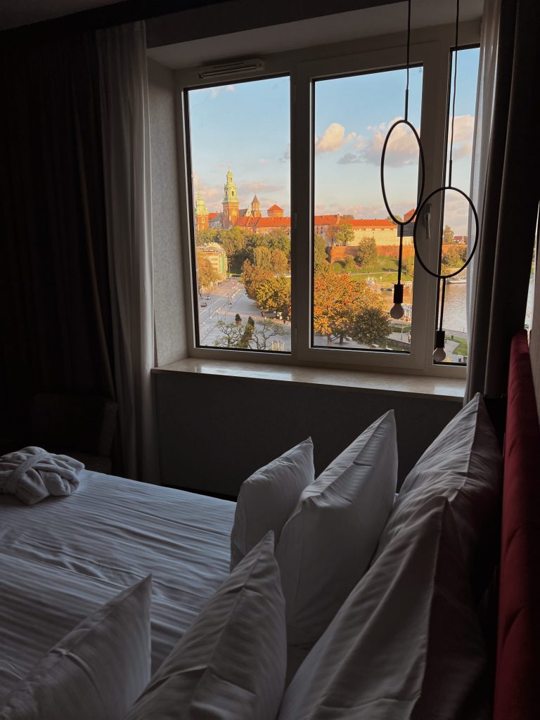 Como siempre comenzamos con nuestro alojamiento, que fue el Hotel Kossak. Es un hotel de cuatro estrellas con una ubicación maravillosa (cinco minutos a pie del Castillo, unos diez del centro histórico y quince minutos del barrio judío) y unas vistas envidiables sobre el río y el castillo. El hotel cuenta con habitaciones modernas y muy confortables, todo el personal es muy amable, y además en su azotea se encuentra ubicado el restaurante Cafe Oranzeria, un lugar estupendo para degustar la gastronomía polaca, platos europeos o algunos cócteles desde su rooftop. Gastronómicamente el hotel es de los mejores en lo que me he alojado, y quiero destacar también su desayuno buffet, provisto de una gran calidad y variedad (con distintas opciones aptas para intolerantes, veganos, etc).